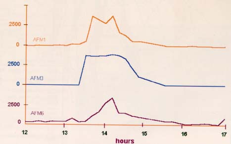 Long term daily flux tends to decrease to less than 50 tons/day and then began to increase again just before the eruption. The maximum rate obtained was about 250 ton/day.