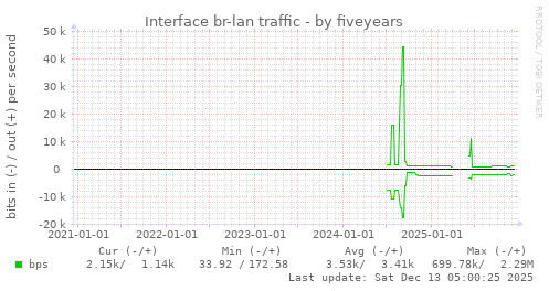 This graph shows the traffic of the br-lan network interface. Please note that the traffic is shown in bits per second, not bytes. IMPORTANT: Since the data source for this plugin use 32bit counters, this plugin is really unreliable and unsuitable for most 100Mb (or faster) interfaces, where bursts are expected to exceed 50Mbps. This means that this plugin is usuitable for most production environments. To avoid this problem, use the ip_ plugin instead.