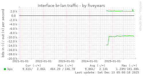 This graph shows the traffic of the br-lan network interface. Please note that the traffic is shown in bits per second, not bytes. IMPORTANT: Since the data source for this plugin use 32bit counters, this plugin is really unreliable and unsuitable for most 100Mb (or faster) interfaces, where bursts are expected to exceed 50Mbps. This means that this plugin is usuitable for most production environments. To avoid this problem, use the ip_ plugin instead.