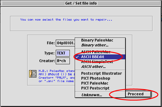 ![]() ![]() ![]() ![]() Step 5: type the "type" and "creator" of the file (if you know them...) or use the pop-up menu where some standard file